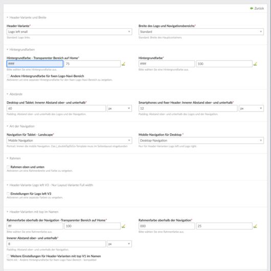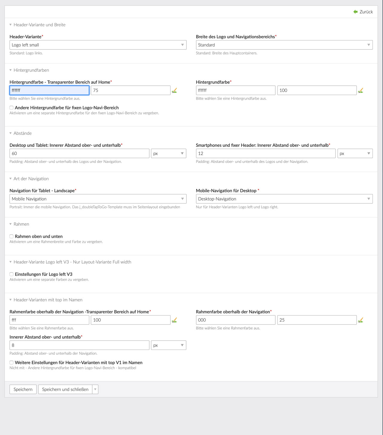 • Logo: Auswahl, Größe für Mobil, Desktop & StickyHeader. Optional 2. Logo für StickyHeader.